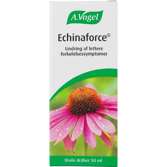 *Pligttekst: Echinaforce® Orale dråber (udtræk af Purpur solhat), pakningsstørrelser 50 ml / 100 ml / 2×100 ml. Læs omhyggeligt indlægssedlen. Indikationer: Naturlægemiddel til brug ved lindring af lettere forkølelses- symptomer. Styrker kroppens immunforsvar og øger derved modstandskraften overfor forkølelse. Dosering: Voksne: 30 dråber i et glas vand 3-5 gange daglig i højst 8 uger. Må kun efter aftale med læge anvendes til gravide, ammende eller børn under 12 år. Særlige advarsler og forsigtighedsregler inden brugen: Bør ikke bruges sammenhængende i mere end 8 uger af gangen. Kontakt læge ved forvær- ring af symptomer eller høj feber. Allergiske patienter skal kontakte lægen inden brug. Præparatet indeholder ethanol (65% Vol.) og må derfor ikke anvendes, hvis du er i behandling med disulfiram (mod alkoholisme) eller metronidazol (mod betændelse). Kontraindikationer: Overfølsomhed over for planter af kurvblomstfamilien (f.eks. krysantemum eller bynke). Tuberkulose, leukæmi, bindevævssygdomme og andre auto- immune sygdomme. Dissemineret sklerose. HIV-infektion, anden immundefekt eller immunosupression. Sygdomme relateret til hvide blodlegemer. Bivirkninger: Ingen almindelige bivirkninger er registreret. Forkortet produktinformation er baseret på produktresumé dateret 20. januar 2020, som kan rekvireres hos A. Vogel Danmark A/S på tlf. 8770 8770 eller www.produktresume.dk