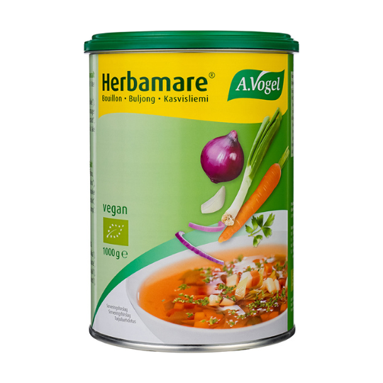 Herbamare er en populær og velsmagende urtebouillon. Den er udviklet efter Alfred Vogels originale opskrifte. Den kan bruge i alle retter, hvor du normalt vil bruge salt- Herbamare kan derfor erstatte saltet og samtidig tilføre mere smag fra urterne. Urtebouillon fra A.Vogel er perfekt til simreretter, saucer, supper, sammenkogteretter og i kogevandet til grøntsager, pasta og ris.