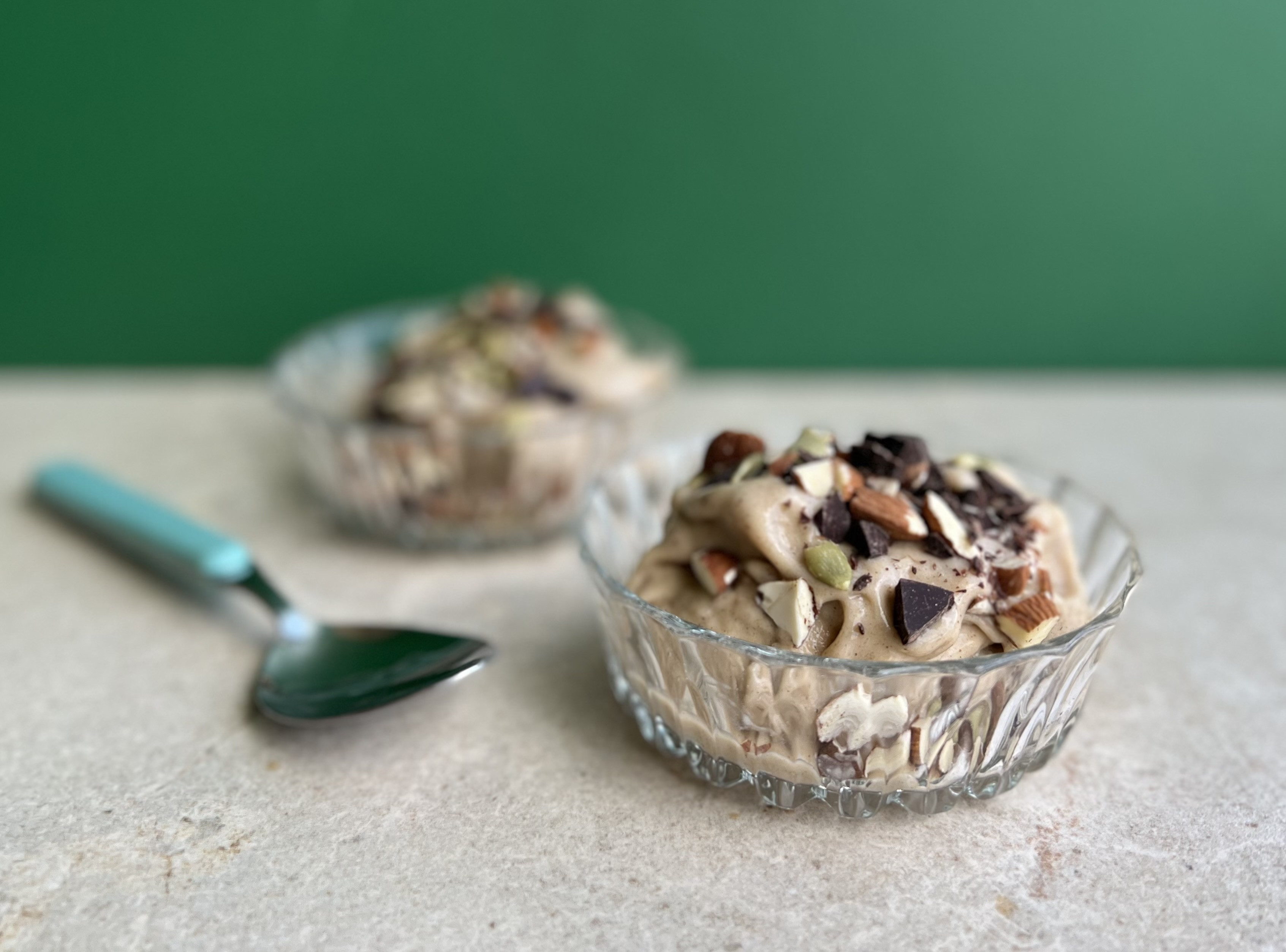 Den er så simpel at lave og samtidig så helt ekstremt velsmagende. For udover banan, skal du kun tilføje plantemælk og vaniljepulver. Og ud kommer en cremet, silkeblød, sød og ret fed is, som smager helt fantastisk. Måske en af verdens bedste.