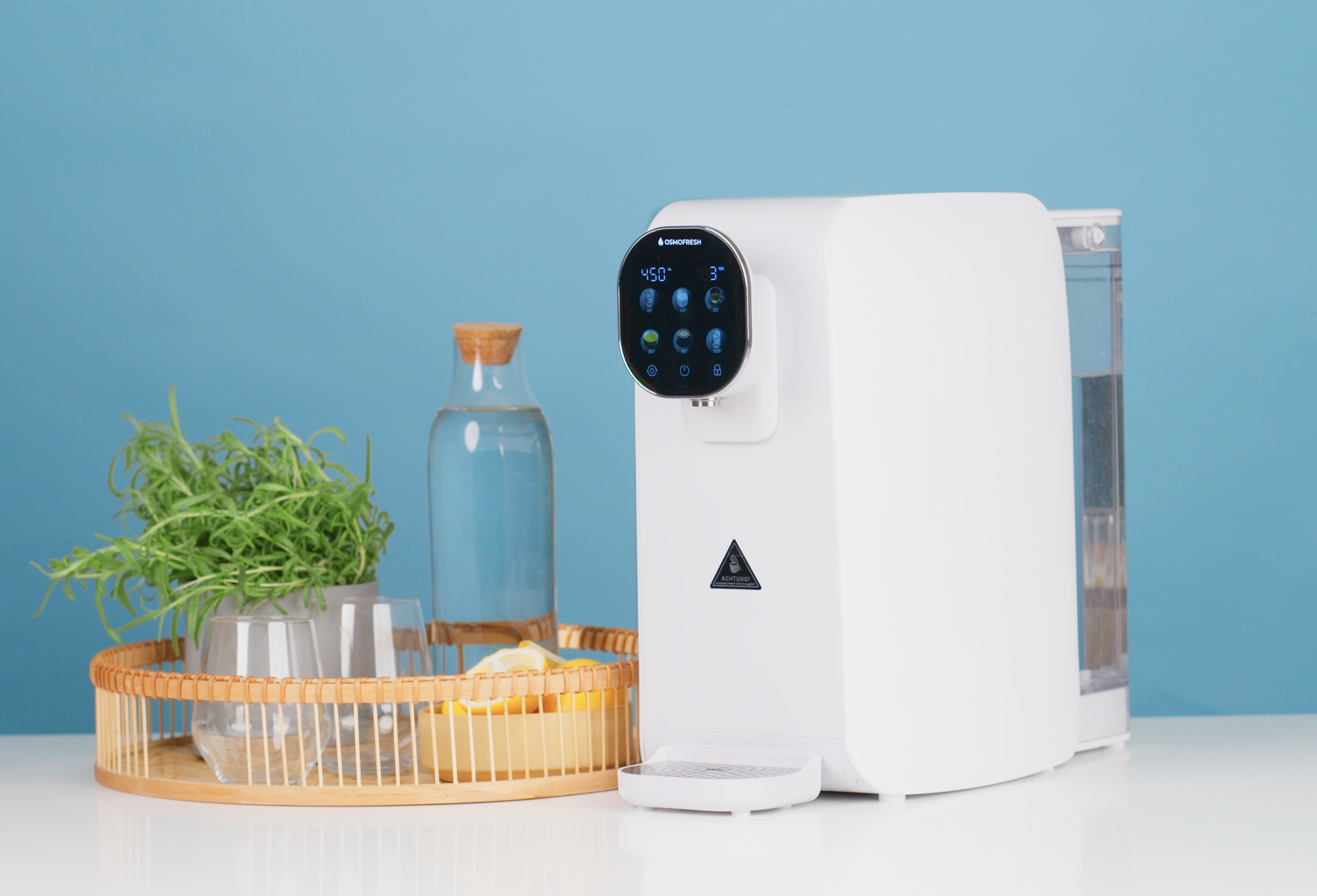 Med Quella Life vandrenser fra OsmoFresh får du et produkt af høj kvalitet, hvilket vægtes højt hos High on Life. Det enkle og simple er også højsædet, når der nøje udvælges produkter - og det må man sige vandrenseren fra OsmoFresh er. På maskinens touch-skærm finder du et overskueligt overblik over dine 6 forskellige valgmuligheder. Og med et let tryk kan du tappe rent vand vand til både kaffe og te, men selvfølgelig også et normalt glas vand. Den nemme betjening i kombination med det enkle og moderne design gør, at den kan passe ind i ethvert hjem.