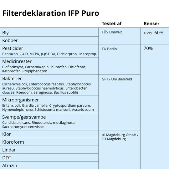 Vandfilteret fra Carbonit benytter et aktivt kul- og fibermembran filter, der produceres under streng kvalitetskontrol og alle filtre testes individuelt. Vandfiltret fjerner de fleste skadelige stoffer vi finder i vores drikkevand. Den specielle filterpatron benytter en internationalt patenteret proces (Carbonit® Monoblock) med yderst fine filterporer (type IFP Puro: 0,15 μm) og meget høj adsorptionsevne.Vandfilterets effektivitet er blevet bekræftet af en række uafhængige institutter i Tyskland og det er bevist at drikkevandet renses for 70% af pesticider, medicinrester, bakterier, mikroorganismer, svampe/gærsvampe, klor, kloroform, Lindan, DDT, Atrazin og over 60% af bly og kobber. Filteret renser ikke for flourstoffer som PFAS og fjerner mindre mængder af kalk.