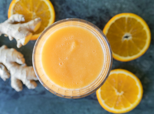 En frisk smoothie med et twist af ingefær, som indeholder både vitamin A, B, C og E samt masser af mineraler.