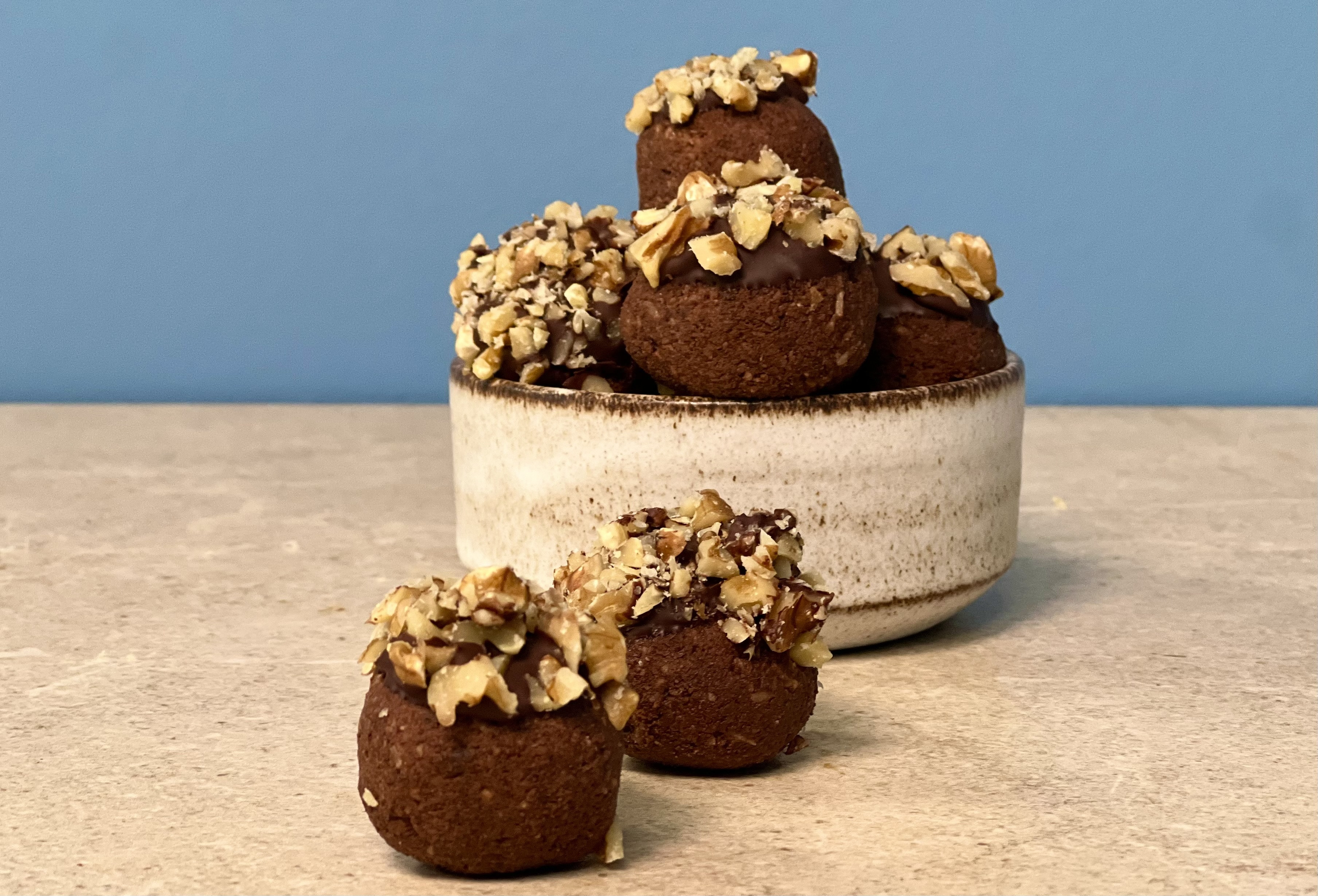 Forkæl dig selv med vores chokolade-appelsinkugler - toppet med et sprødt valnødde touch.