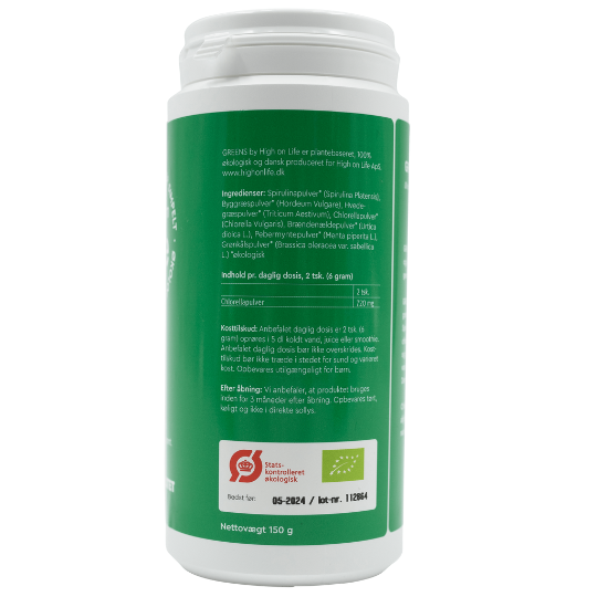 GREENS by High on Life er sammensat af frysetørret, grønne græsser, alger og urter. Spirulina, byggræs, hvedegræs, chlorella, brændenælde, pebermynte og grønkål. Lige til at røre i et glas vand, juice eller smoothie. Det mener vi er SUPER SIMPELT.
