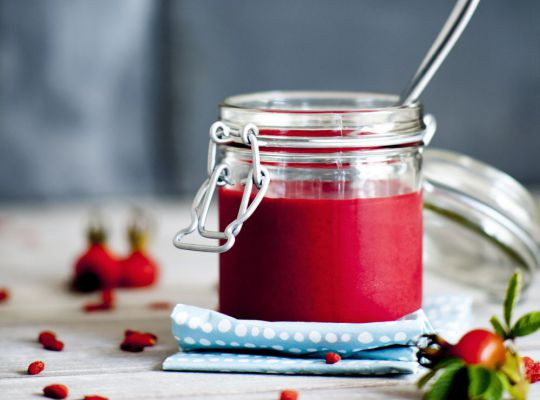 Smuk, sund og mættende er ord, som bedst beskriver denne kærlighedserklæring af en smoothie. Gojibær og hyben i en og samme smoothie er et sjældent syn. Sammen byder de ind med et hav af næringsstoffer som f.eks. C-vitamin og antioxidanter. Kokosmælk skaber eksotiske rammer, mens rødbede øger iltoptagelsen og forfører dig med dens potente farve.