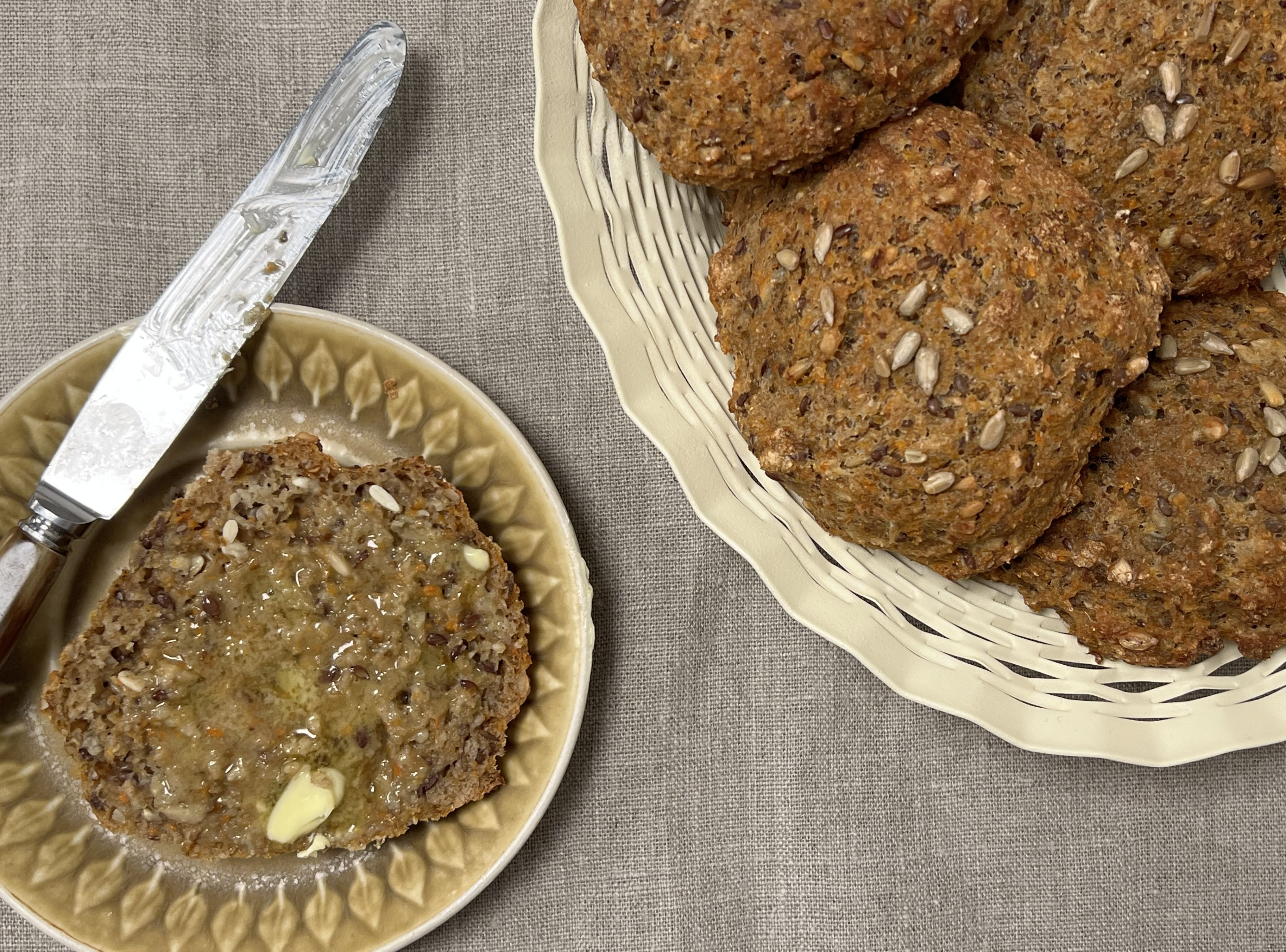 Vi har lavet en morgenbolle, hvor vi har brugt pulpresterne fra gulerodsjuice - så intet går til spilde.
