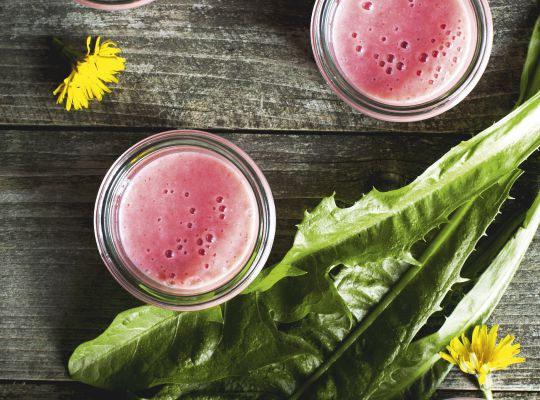 Denne lyserøde og softice-lignende smoothie smager helt fantastisk. Hvem gider spise pasteuriseret jordbæryoghurt, når man kan lave sin helt egen uden tilsat sukker eller kunstige sødemidler. Mælkebøtteblade indeholder 187 gange så meget A-vitamin som banan og 20 gange så meget B6-vitamin som broccoli. Selvfølgelig skal vi ikke køre vores ukrudt på genbrugsstationen!