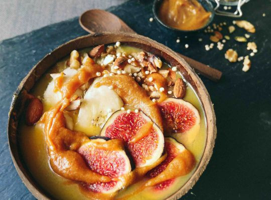 En lækker og sund anretning toppet med granola, poppet quinoa og en sundere version af en cremet karamel. Udskift endelig ingredienserne med frugter og bær i sæson. Så hvis det ikke er sæson for figner, så top desserten med fx tynde skiver af blomme, bær, appelsin, æble eller banan. Opskriften er udviklet af Michala Kramer, som står bag Micadeli.dk – en madblog med vegetaropskrifter. Brug en powerblender som Vitamix til opskriften.