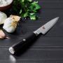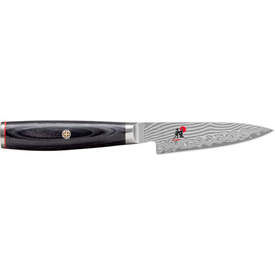 Denne smukke, og ikke mindst skarpe, urtekniv har et knivblad, som er udformet af 49 lag stål, med en hårdhed på ca. 61 Rockwell. Det 13 cm lange knivblads smukke design er inspireret af et meget berømt japansk træsnit kaldet "Kanagawa oki nami ura", som viser en stor bølge og Mount Fuji i baggrunden.