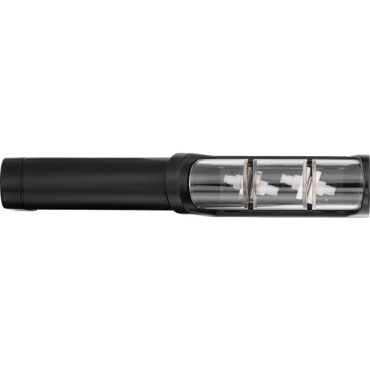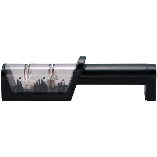 Med knivskærperen med keramiske hjul fra Miyabi kan dine knive blive skærpet finere og med større komfort. Skærperen har en forudindstillet vinkel, således at knivene altid er i denne rette position. Bladet trækkes først flere gange igennem det diamantbelagte hjul så bladet får den rette vinkel på skæret. Derefter trækkes kniven flere gange igennem det keramiske hjul. Dette gør kniven ualmindeligt skarp, så den let og ubesværet kan skære igennem grøntsager, fisk og andre råvarer. Et silikonegreb hjælper knivskærperen med at forblive stabil, så den ikke glider under arbejdet. Desuden har knivskærperen et ergonomiske skaft, som er lavet af vedligeholdelsesvenligt plast og kan holdes behageligt af både venstrehåndede og højrehåndede.