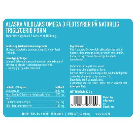 Nani Alaska Vildlaks Omega 3 er en ren, frisk og bæredygtig Omega-3 fiskeolie fra friskfangede vildlaks.