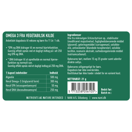 Nani Alge Omega 3 bidrager til en normal hjernefunktion og et normalt syn. Bare én kapsel indeholder hele 300 mg omega-3 fedtsyrer, hvor 250 mg er DHA og 50 mg er EPA. Begge disse fedtsyrer bidrager til en normal hjertefunktion.