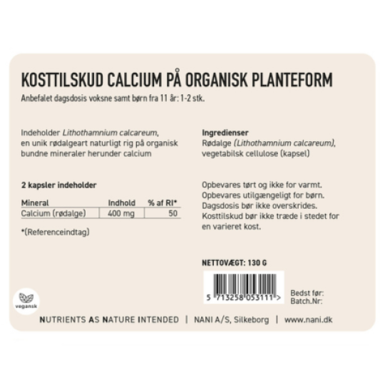 Nani Calcium er et plantebaseret og organisk whole food calciumtilskud, der udlukkende består af en unik rødalgeart fra Island med et særligt højt indhold af calcium. Tilskuddet fra Nani er særligt velegnet til dig, der ikke spiser mælkeprodukter.
