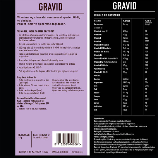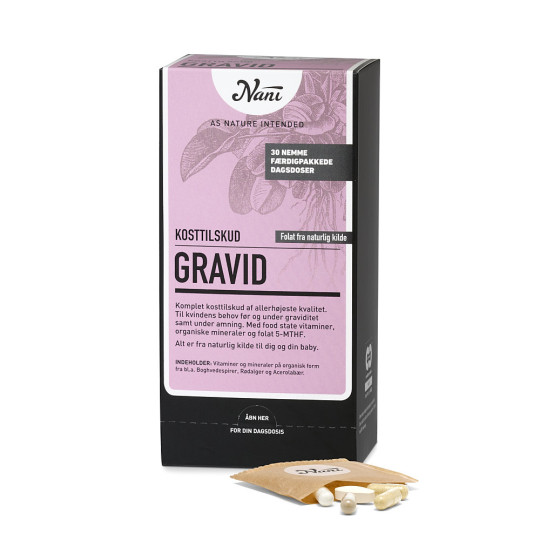 Med Nani kosttilskud til gravide får du et komplet tilskud af allerhøjeste kvalitet, som allerede kan påbegyndes i planlægning af graviditet. Skabt af det bedste fra naturen imødekommer kosttilskuddet kvindens behov før og under graviditet samt under amning.