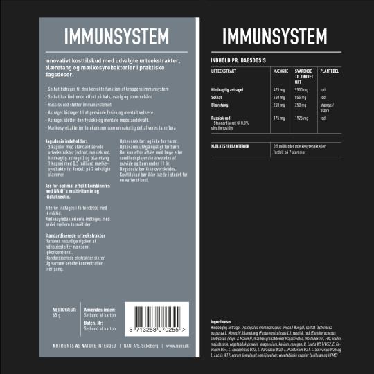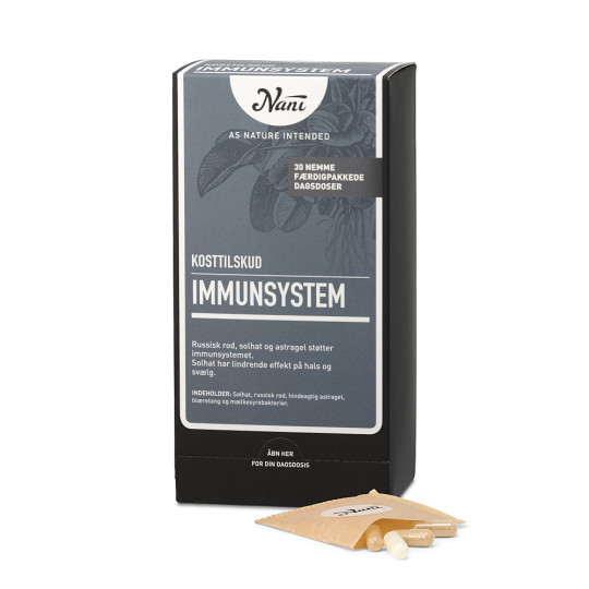 Nani kurpakke Immunsystem er et innovativt kosttilskud skabt af det bedste fra naturen. Med nøje udvalgte urteekstrakter, blæretang og mælkesyrebakterier bidrages der til et modstandsdygtigt immunsystem.