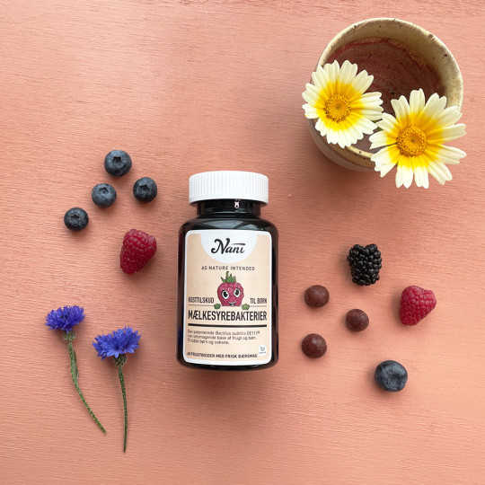 Nani mælkesyrebakterier til børn indeholder 1 mia. levende bakterier af den patenterede Bacilllus subtilis DE111® stamme, som udmærker sig med mere en 30 videnskabelige og veldokumenterede studier. Den er bl.a. spordannende og særdeles hurtig til at opformere sig i tyndtarmen samt utrolig stabil i forhold til mavesyre og temperatur. Derfor er kosttilskuddet nemt at have lige ved hånden, da det ikke kræver køl, som andre mælkesyrebakterier.