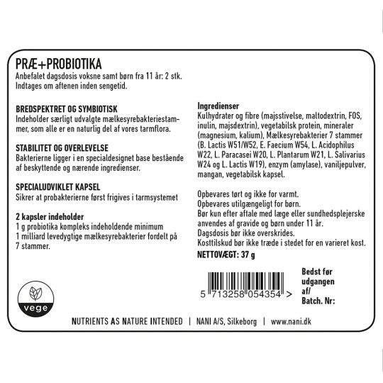 Nani Præ+Probiotika indeholder 7 indkapslet mælkesyrebakterier i kombination med præbiotika, som indeholder fibre og nærringsstoffer, der nærer og gavner de gode bakteriers vækst og overlevelse i tarmen.