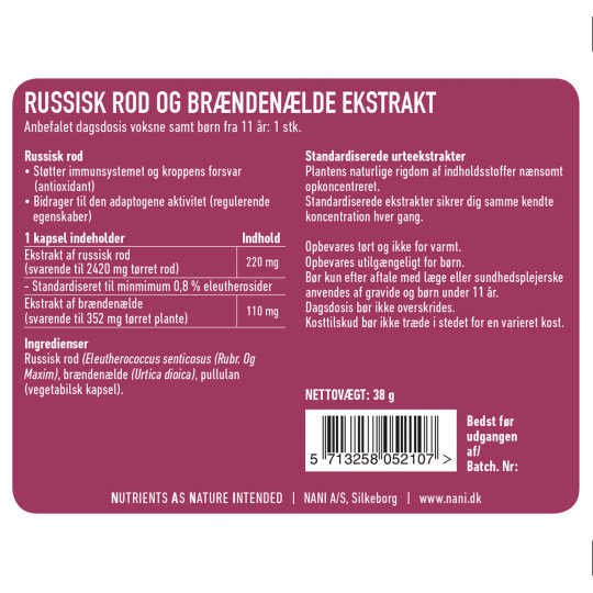 Ingredienser: Russisk rod (Eleutherococcus senticosus (Rubr. Og Maxim), brændenælde (Urtica dioica), pullulan (vegetabilsk kapsel).