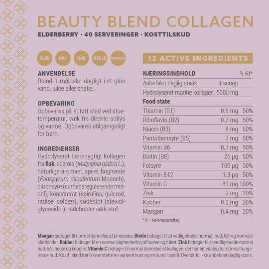 Når kroppens egen produktion af kollagen falder med alderen, er det vigtigt at få den gennem mad og/eller tilskud. Plent Beauty blend collagen giver din hud vigtige byggesten. I et scoop får du både vitaminer, mineraler og collagen som tilsammen understøtter huden. Plent beauty blend collagen indeholder 12 aktive ingredienser lige fra Vitamin C til B-vtiaminer, zink og kobber, som tilsammen understøtter hud, hår, negle, knogler, slimhinder, bindevæv og hudens glød.