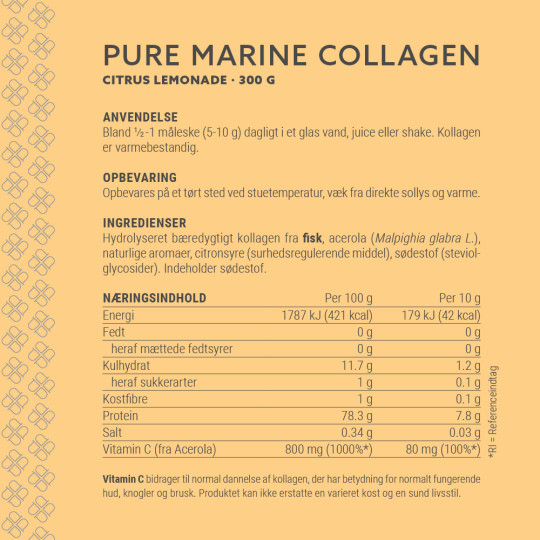 Ingredienser: Hydroliseret bæredygtigt kollagen fra FISK, acerola, naturlige aroma, citronsyre (surhedsregulerende middel), sødestof (Steviolglycosider). Indeholder sødestof.