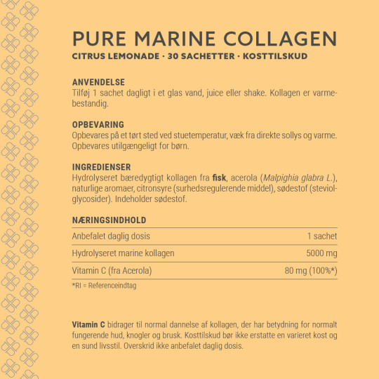 Ingredienser: Hydroliseret bæredygtigt kollagen fra FISK, acerola, naturlige aroma, citronsyre (surhedsregulerende middel), sødestof (Steviolglycosider). Indeholder sødestof.