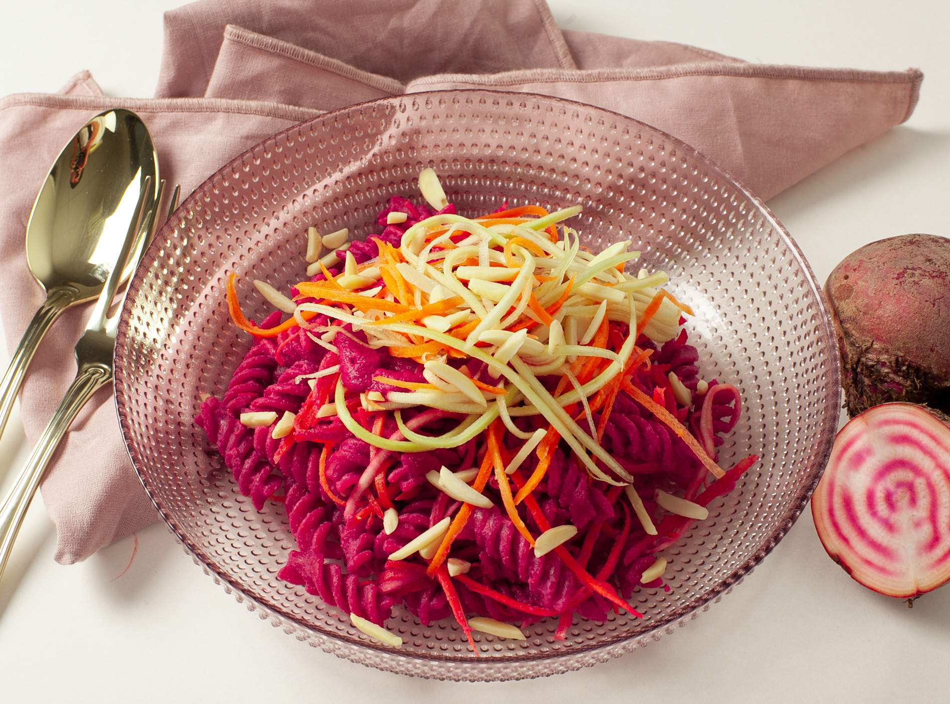 Elsker du også rødbeder? Prøv denne farverige rødbedepastasauce toppet med persille og hakkede salte mandler. Det smager fantastisk og er lavet på ingen tid.Opskriften er lavet med en rå rødbede, men gemmer du dine rester i vakuumbøtter, fx. i dette tilfælde en bagt rødbede fra dagen før kan du fint tænke dine rester ind i næste dags måltid og minimér dit madspild.