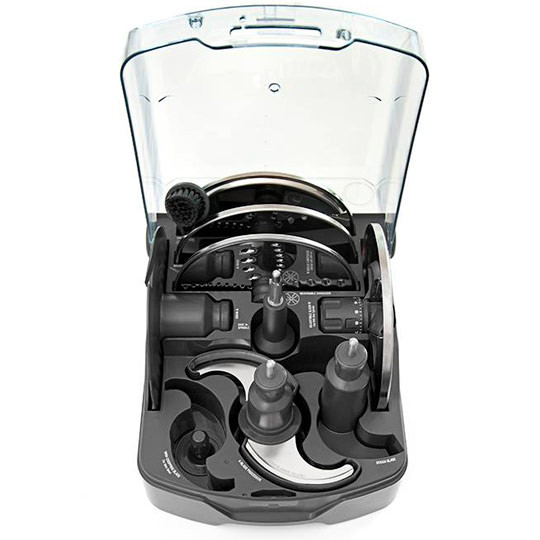 Til foodprocessoren hører desuden hakke og snitteudstyr samt dejkniv til æltning, som kommer i en fin opbevaringsboks. Der medfølger både en skål på 3,7 liter og en skål på 1 liter, som stables inden i hinanden, for nem opbevaring. Skålen på 3,7 liter kan indeholde op til de 3,7 liter når der blendes/hakkes tørre ingredienser, hvor der ved tykke flydende blends max kan blendes 2,5 liter ad gangen.