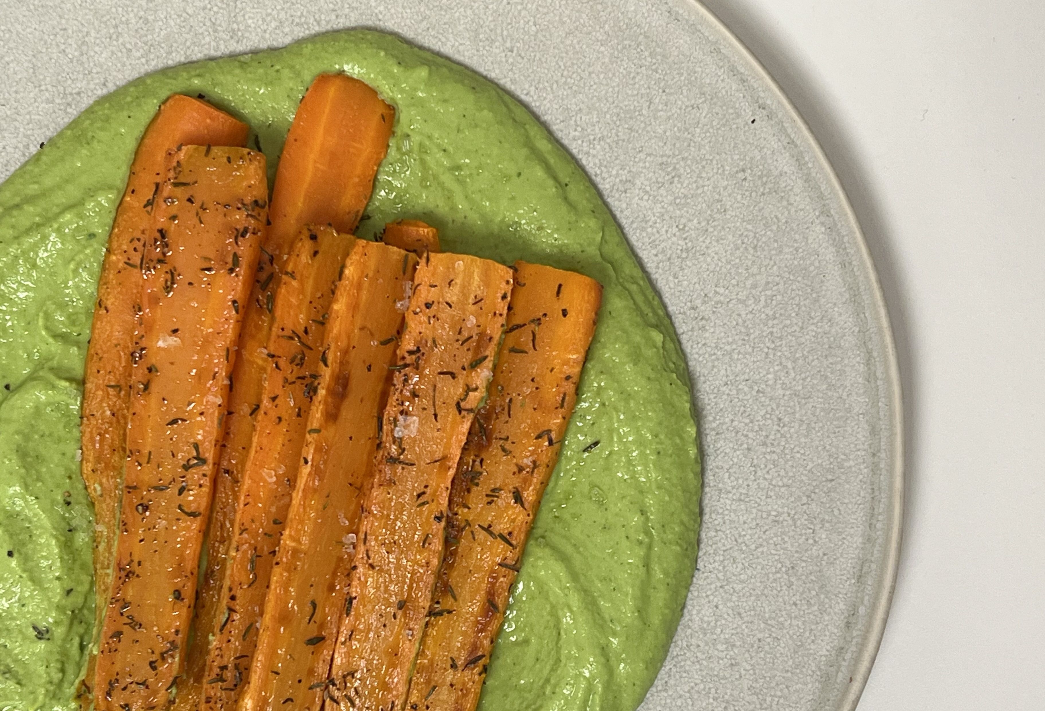 Gulerødderne dyppes i en cremet ærtedip, der kombinerer den friske smag fra ærter med en snert af hvidløg og citron - den perfekte balance mellem knasende og cremet.